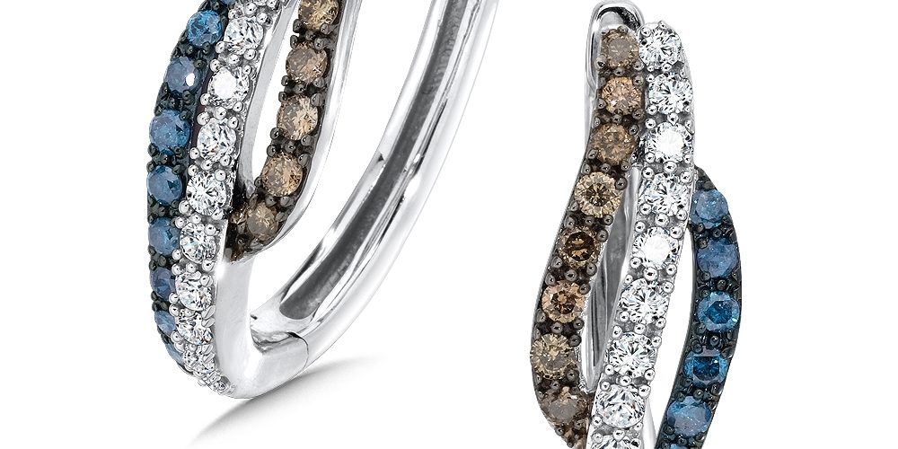 White gold treated blue, cognac & white diamond hoops
